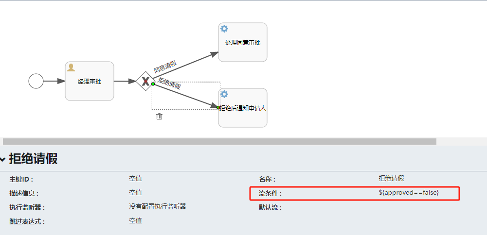 拒绝请假的线条输入${approved==false},传入的参数approved==false则执行这条流程