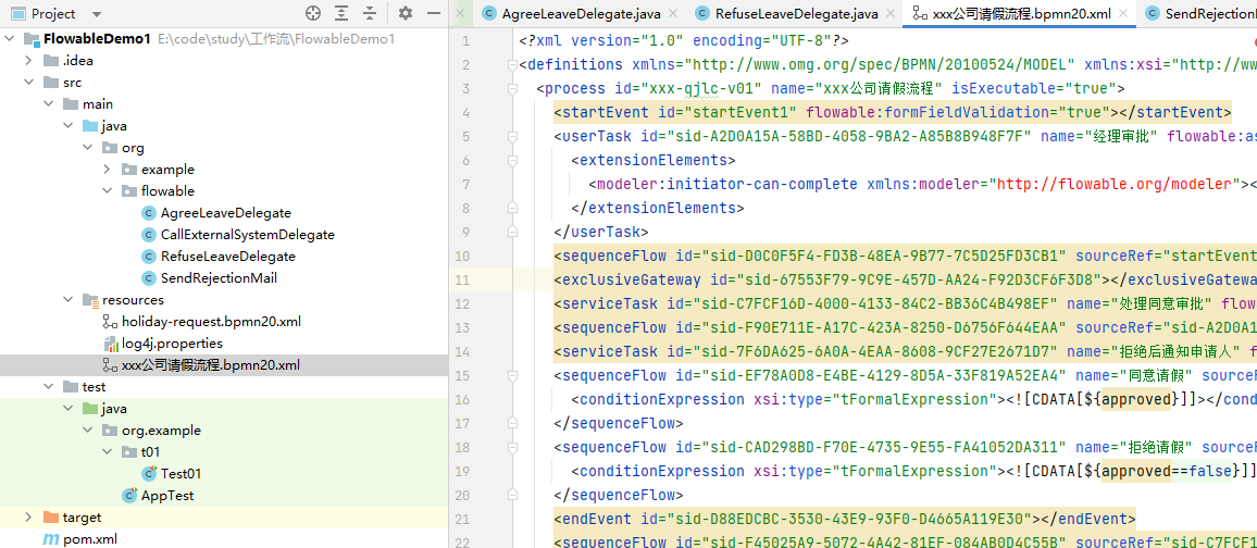 将上面的XML保存在src/main/resources文件夹下名为holiday-request.bpmn20.xml的文件中。
