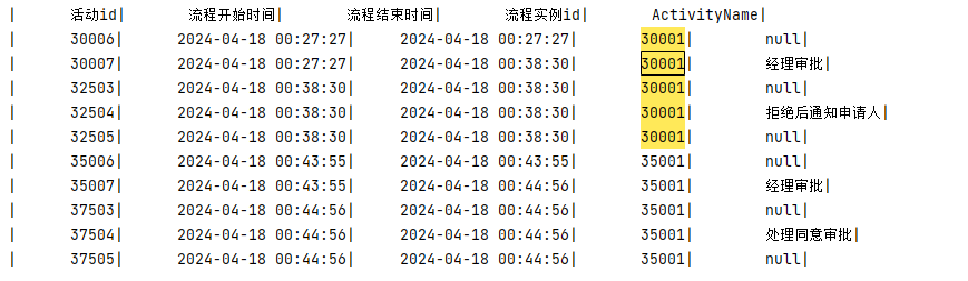 打印结果如下,流程实例id,一个是30001一个是35001.