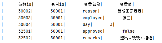 //模拟请假流程的参数 variableMap.put("employee","张三"); variableMap.put("day",3); variableMap.put("reason","回家玩玩"); ProcessInstance holidayRequest = processEngine.getRuntimeService() .startProcessInstanceByKey("holidayRequest", variableMap); System.out.println("holidayRequest.getProcessDefinitionId() = " + holidayRequest.getProcessDefinitionId()); System.out.println("holidayRequest.getId() = " + holidayRequest.getId()); System.out.println("holidayRequest.getProcessInstanceId() = " + holidayRequest.getProcessInstanceId()); System.out.println("holidayRequest.getActivityId() = " + holidayRequest.getActivityId()); }