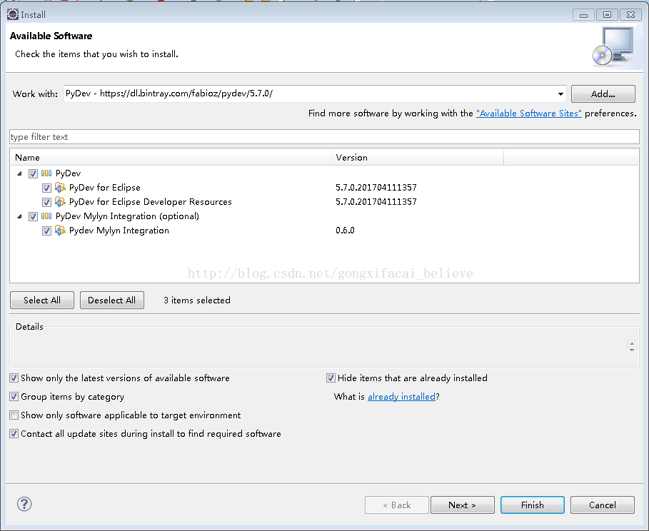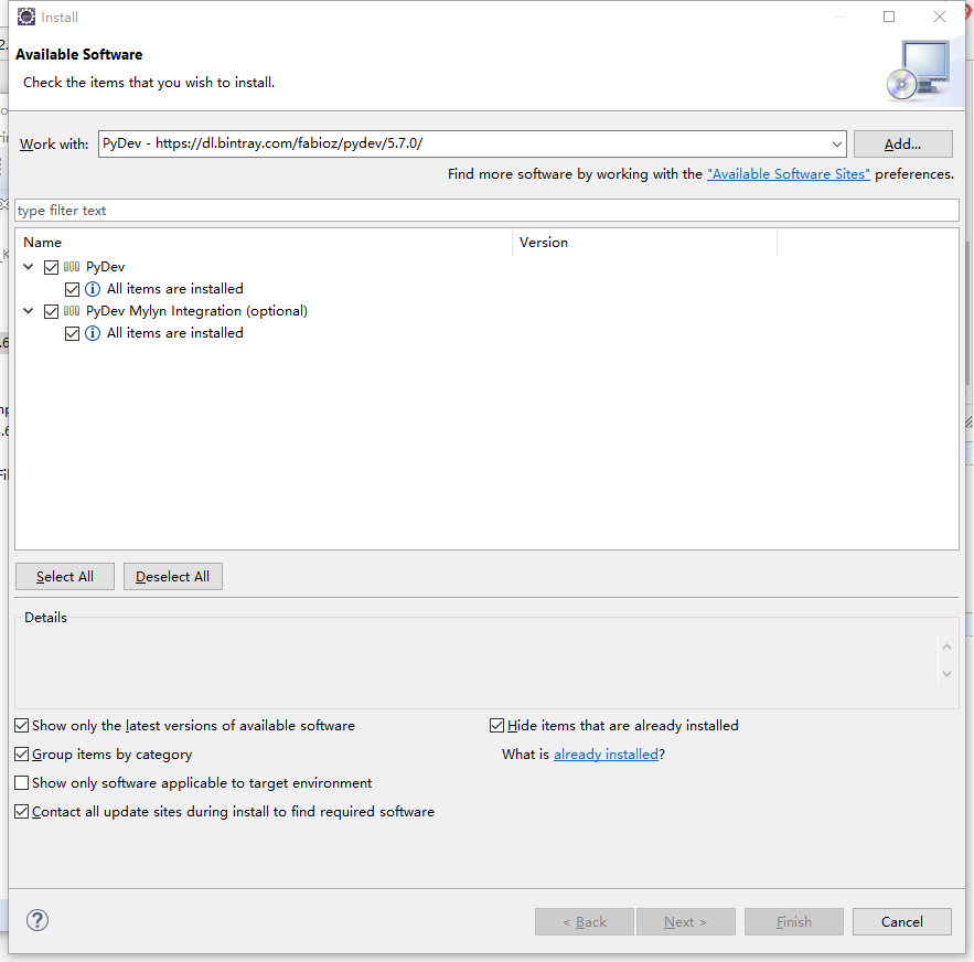 3、出现如下界面,全选PyDev及PyDev Mylyn Integration(optional),点击Next,如下图。
