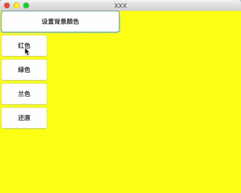 import java.awt.*; import java.awt.event.ActionEvent; import java.awt.event.ActionListener; import java.awt.event.WindowAdapter; import java.awt.event.WindowEvent; /** * 点击按钮改变颜色 * * @author wanghao * @create 2018-07-07 下午4:57 **/ public class ColorWindow { public static void main(String[] args) { final Frame f=new Frame("XXX"); f.setLayout(null); f.setSize(500,400); f.setLocation(300,200); // 设置背景颜色 初始背景颜色黄色 f.setBackground(new Color(255, 255, 0)); Button red=new Button("红色"); red.addActionListener(new ActionListener() { @Override public void actionPerformed(ActionEvent e) { System.out.println("改变背景颜色"); Color bgColor = new Color(255, 0, 0); // 更改背景颜色为红色 f.setBackground(bgColor); } }); Button green=new Button("绿色"); green.addActionListener(new ActionListener() { @Override public void actionPerformed(ActionEvent e) { System.out.println("改变背景颜色"); Color bgColor = new Color(0, 255, 0); // 更改背景颜色绿色 f.setBackground(bgColor); } }); Button Blue=new Button("兰色"); Blue.addActionListener(new ActionListener() { @Override public void actionPerformed(ActionEvent e) { System.out.println("改变背景颜色"); Color bgColor = new Color(0, 0, 255); // 更改背景颜色蓝色 f.setBackground(bgColor); } }); Button revert=new Button("还原"); revert.addActionListener(new ActionListener() { @Override public void actionPerformed(ActionEvent e) { System.out.println("改变背景颜色"); Color bgColor = new Color(255, 255, 0); // 更改背景颜色蓝色 f.setBackground(bgColor); } }); Button title=new Button("设置背景颜色"); title.setBounds(0,20,250,50); //设置按钮尺寸 red.setBounds(0,70,100,50); green.setBounds(0,120,100,50); Blue.setBounds(0,170,100,50); revert.setBounds(0,220,100,50); f.add(title); f.add(red); f.add(green); f.add(Blue); f.add(revert); f.addWindowListener(new WindowAdapter(){ @Override public void windowClosing(WindowEvent e) { System.out.println("我关了"); System.exit(0); } }); f.setVisible(true); } }