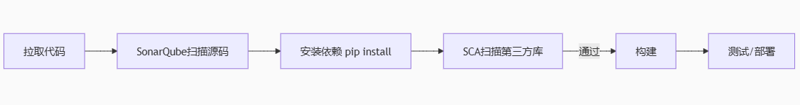 SCA工具: 源代码集成后运行,扫描分析项目引用的第3依赖方库(如 requirements.txt 或 pipenv 中的依赖)的已知漏洞、许可风险和过时依赖。