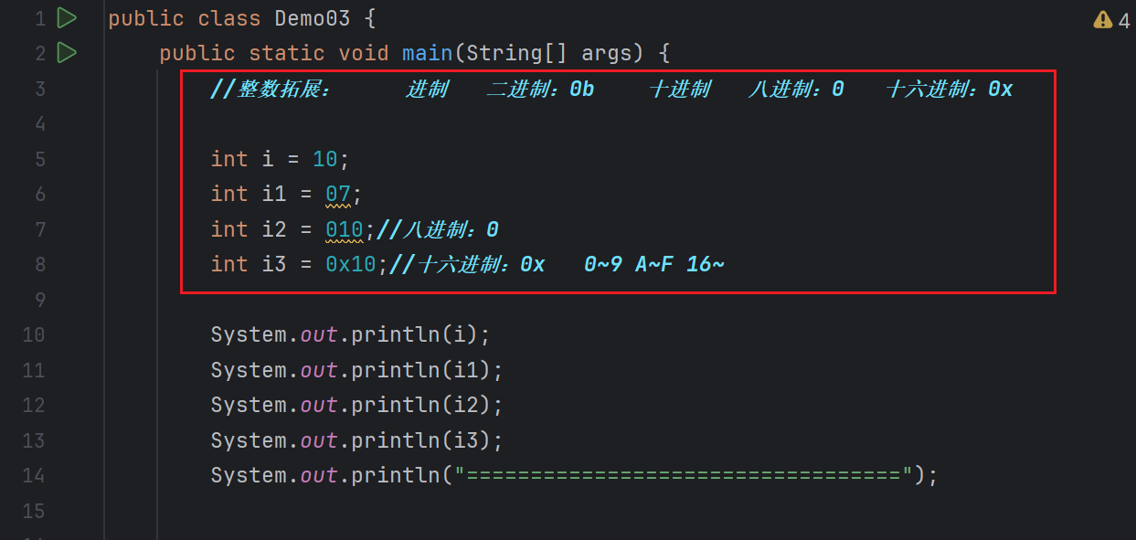 - 进制 / 二进制:0b/ 十进制 / 八进制:0 / 十六进制:0x