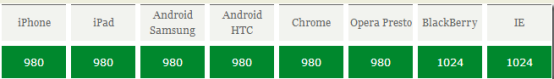 通俗的讲,移动设备上的viewport就是设备的屏幕上能用来显示我们的网页的那一块区域,在具体一点,就是浏览器上(也可能是一个app中的webview)用来显示网页的那部分区域,但viewport又不局限于浏览器可视区域的大小,它可能比浏览器的可视区域要大,也可能比浏览器的可视区域要小。在默认情况下,一般 来讲,移动设备上的viewport都是要大于浏览器可视区域的,这是因为考虑到移动设备的分辨率相对于桌面电脑来说都比较小,所以为了能在移动设备上正 常显示那些传统的为桌面浏览器设计的网站,移动设备上的浏览器都会把自己默认的viewport设为980px或1024px(也可能是其它值,这个是由 设备自己决定的),但带来的后果就是浏览器会出现横向滚动条,因为浏览器可视区域的宽度是比这个默认的viewport的宽度要小的。下图列出了一些设备上浏览器的默认viewport的宽度。