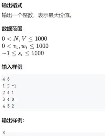 #include <iostream> #include <algorithm> #include <vector> using namespace std; const int N = 2020; int n, m; int f[N]; //全局变量,被初始化0 struct Good{ int w, v; int s; //-1为01背包,0完全背包,>0为多重背包 }; int main() { vector<Good> goods; cin >> n >> m; //初始化物品数量和背包容积 for (int i = 1; i <= n; i++) //初始化二进制拆分后的数量和价值 { int w, v, s; cin >> w >> v >> s; if (s > 0){ for (int k = 1; k <= s; k *= 2){ //注意:k从1开始,01背包会进行选或者不选,当所有拆分都不选择,那么就是没有选择这个物品 s -= k; goods.push_back({ w*k, v*k, -1 }); //插入当前二进制拆分物品 } if (s > 0) goods.push_back({ s*w, s*v, -1 }); //插入最后剩余的个数 } else goods.push_back({ w, v, s }); } //开始进行01背包求解问题 for (auto g : goods){ if (g.s==-1) //01背包问题 for (int j = m; j >= g.w; j--) //注意:需要添加我们将判断条件提到这一步当中,保证剩余容量大于当前物品的体积 f[j] = max(f[j], f[j - g.w] + g.v); //对应不选和选 else for (int j = g.w; j <= m; j++) //注意:需要添加我们将判断条件提到这一步当中,保证剩余容量大于当前物品的体积 f[j] = max(f[j], f[j - g.w] + g.v); //对应不选和选 } cout << f[m]<<endl; system("pause"); return 0; }