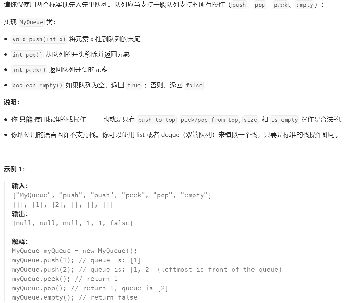 栈是先进后出的结构,队列是先进先出的结构,也就是说队列的pop()操作第一个弹出的应该是最早进去的,要用栈实现队列,就要想办法按进入顺序拿到元素。可以使用两个栈,一个入栈用于实现push(),另一个出栈与入栈一起实现pop(),要执行pop操作的时候,应该把push到入栈的元素依次弹出再放入出栈里,然后出栈再执行pop,这样就实现了队列的特性。