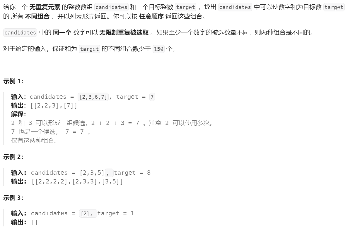 回溯中的组合问题,但是该问题中允许组合里的元素重复使用,所以在回溯三部曲中,startIndex 不需要在递归中排除当前已使用的元素,也就是在循环中调用递归函数时传参是 i.