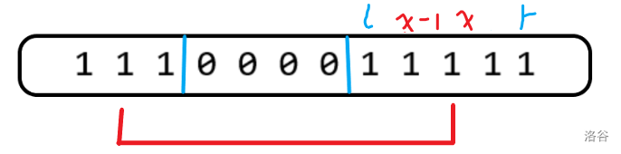 如上图所示,\(S_r\) 比 \(S_{r-1}\) 只在红色段上多 \(1\) 的贡献。红色段的左端点就是最靠右的长度为 \(x-1\) 的连续段 \(1\)。循环一边就可以计算出左端点。