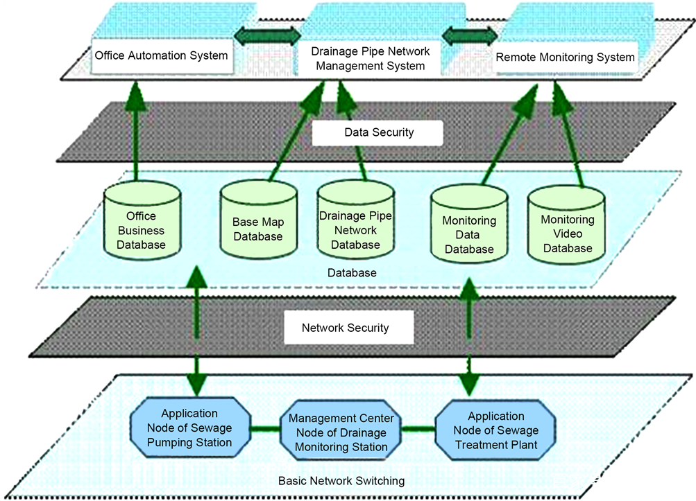 基于城市防洪系统应用流程、物联网技术应用、排水设施管理流程、以及借助物联网和地理信息技术的集成应用,对城市排水防涝指挥进行有效管控和应用。现行城市排水防涝管理体系如图4所示. 基于信息传输应用环节,数据信息不仅具有很强的保密性,同时具有技术保障,实现数据完整性的保证应用,充分保护物联网的功能传输应用,从而使用系统有效地基于无线网络的综合保障。