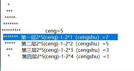 i = 5#定义变量i为正负三角形总行数 for l in range(1, i + 1):#循环出正三角形的行数 for space in range(i - l):#打印空格数 空格数=i-空格对应的层数L print(' ', end='') for star in range(2 * l - 1):#打印*数 2倍的i-对应层数 print('*', end='') print()#打印正三角形 for l in range(1, i + 1):%循环出负三角形的行数(最后一行全是空格) for space in range(i + 1 - l, i + 1):逗号左边是循环起始值右边是循环次数 print(' ', end='') for star in range(2 * i - 1 - 2 * l):#打印*数 2倍的i-1-2*对应层数