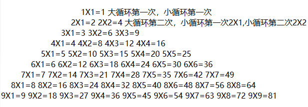 i = 9#定义总循环次数 for l in range(1, 10):#设定大循环上限 (i,0,-1) for space in range(i - l):#设定乘法表前面的空格数 (i+1,l+1,-1) print(' ', end='') for c in range(1, l + 1):#设定小循环里的循环次数 (l,0,-1) print('%sX%s=%s ' % (l, c, l * c), end='')#%s占位符也可用%d数字占位符 print()#大循环每循环完一次就要换行一次