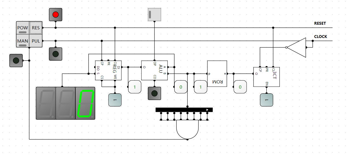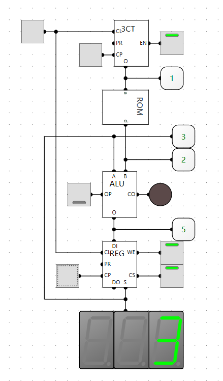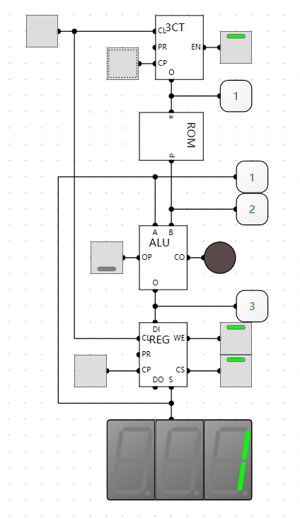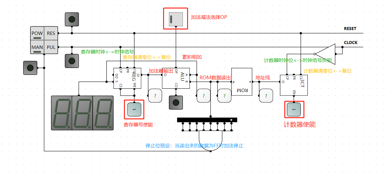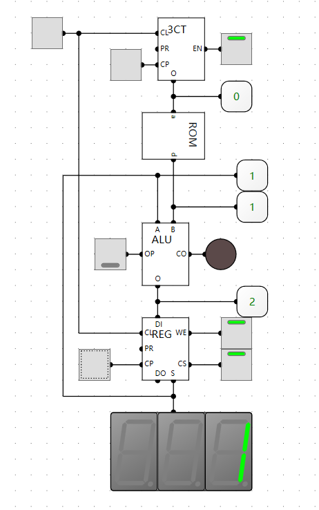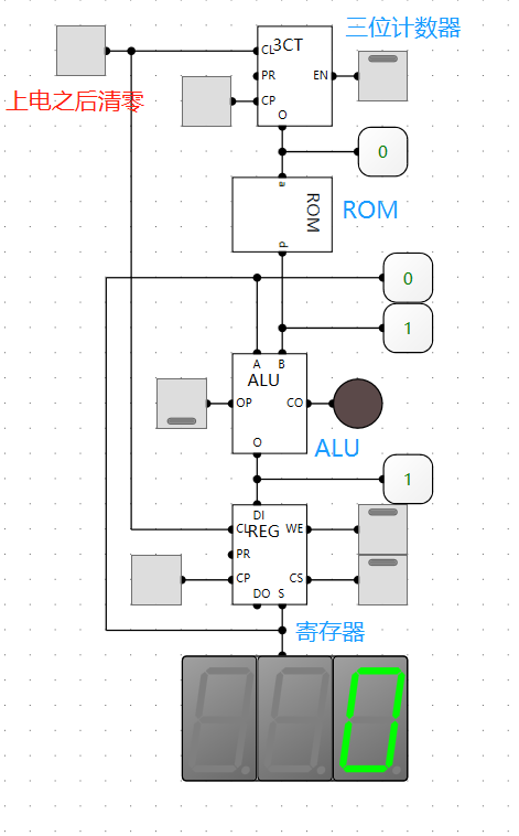 ALU和三位计数器、ROM、寄存器我们可以组成一个半自动加法器,如下所示