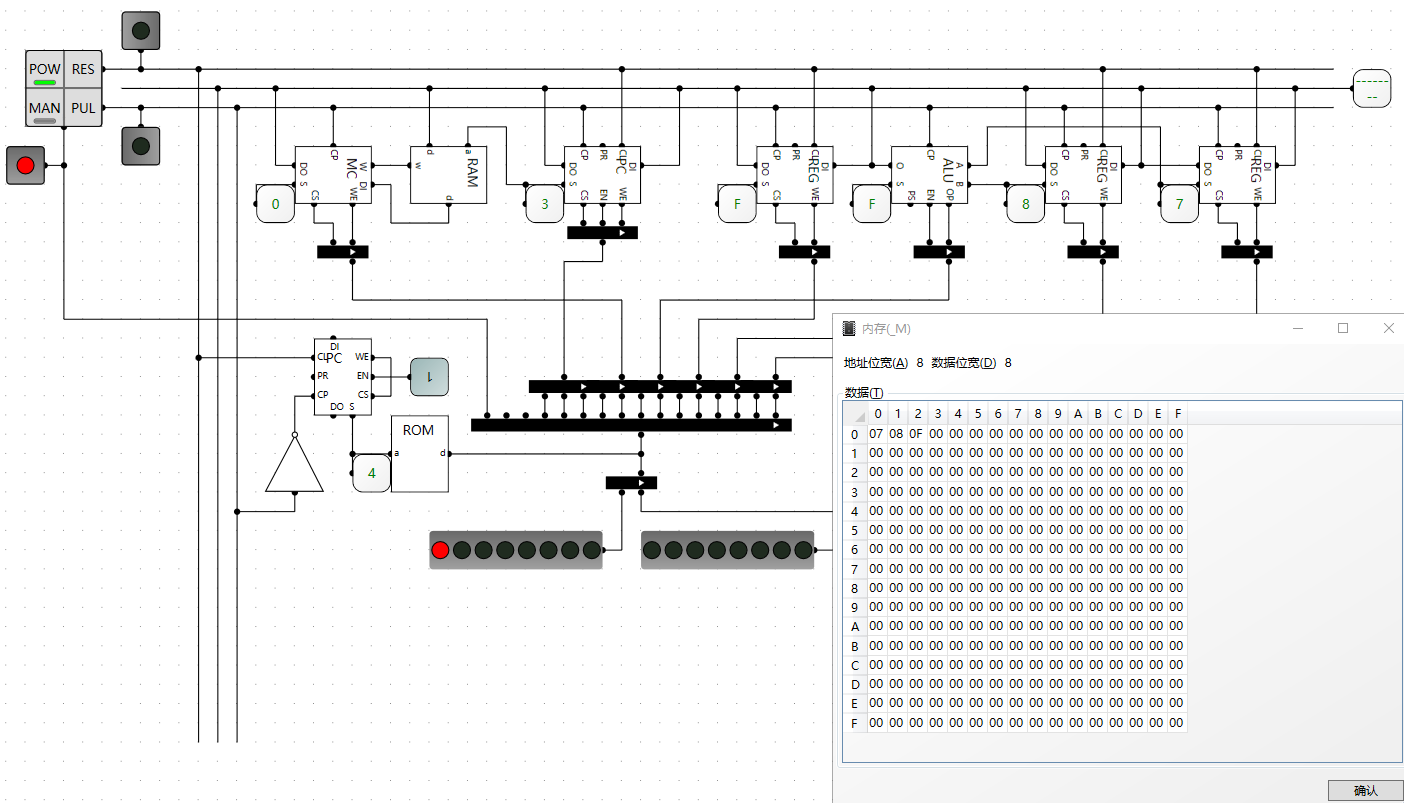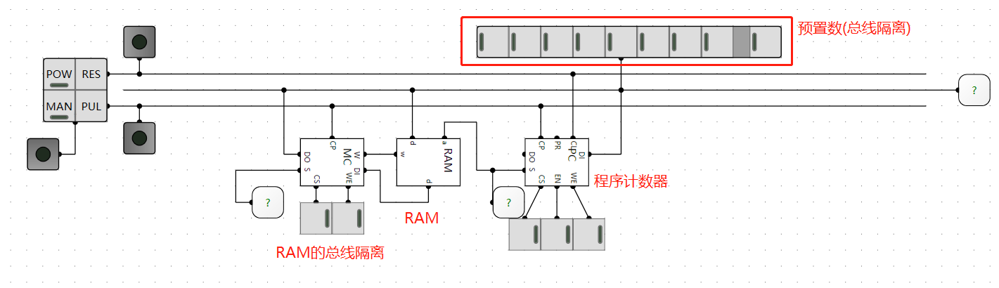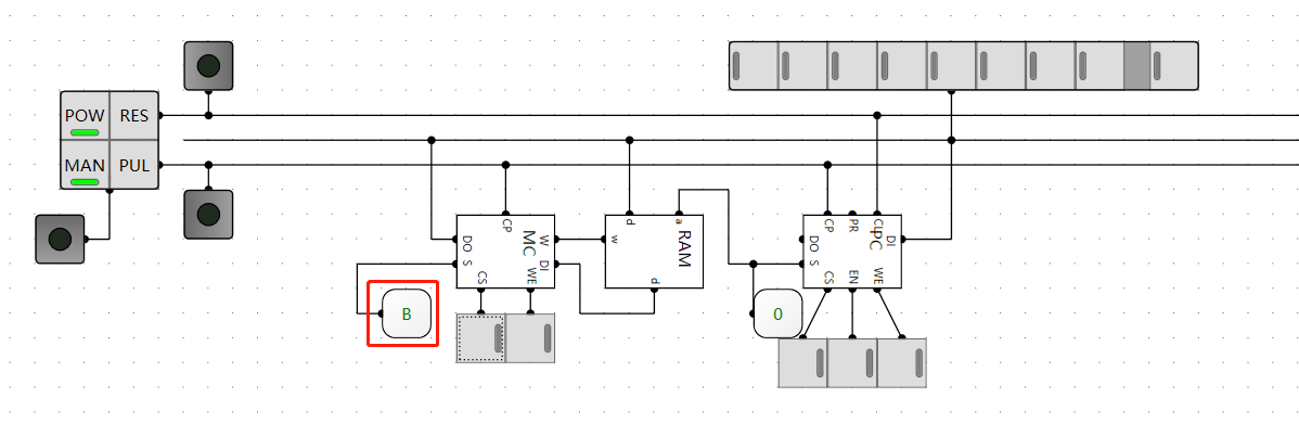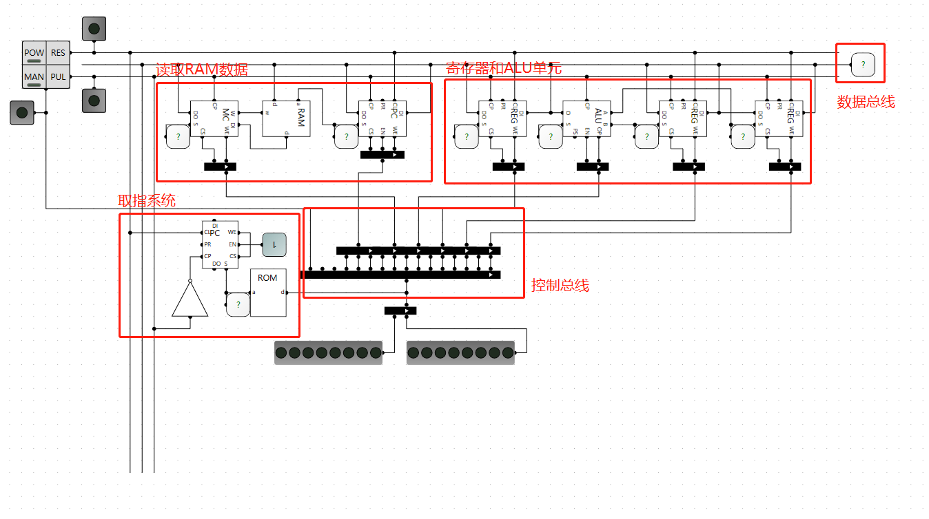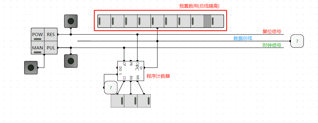 POW:启动开关,1启动,0关闭MAN:手动时钟开关,1手动提供时钟,0自动时钟(测试用)RES:复位按键,按下之后总线提供一个复位信号PUL:手动时钟按键,通过该按键手动提供时钟信号(测试用)