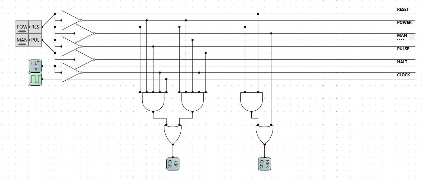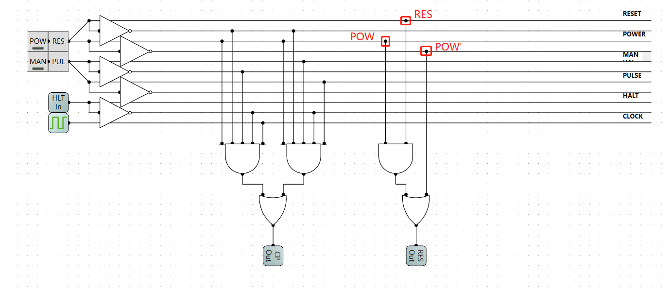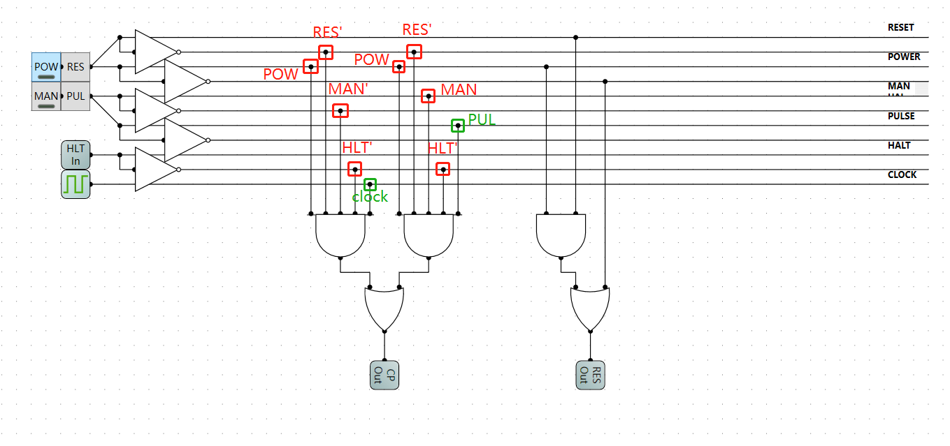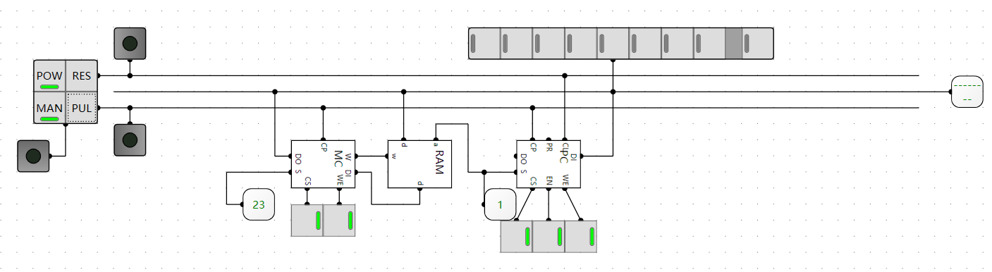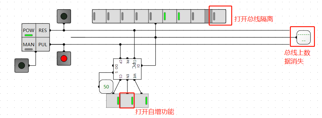 POW:启动开关,1启动,0关闭MAN:手动时钟开关,1手动提供时钟,0自动时钟(测试用)RES:复位按键,按下之后总线提供一个复位信号PUL:手动时钟按键,通过该按键手动提供时钟信号(测试用)