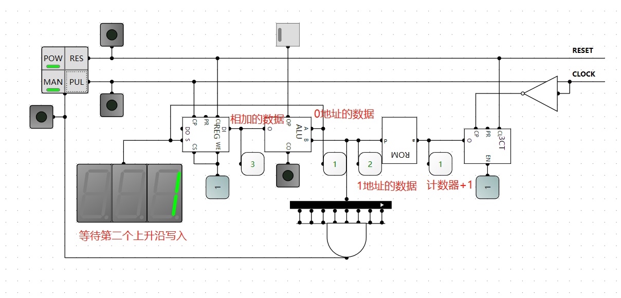 - 按下POW,启动全自动加法机,此时时钟信号打开,复位信号关闭(为了方便观察,使用手动信号),按下PUL输入,第一个上升沿,寄存器执行写操作,将ROM的0地址数据写到A输入口;松开PUL,第一个下降沿,对应计数器的第一个上升沿,计数器+1,ROM地址+1,读出ROM的1地址数据。
