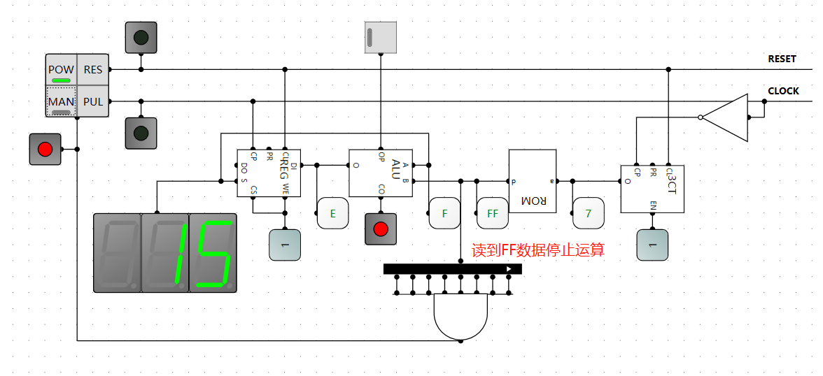 - 依次类推,关闭手动时钟信号,开启自动时钟信号,全自动加法机自动完成运算(读到FF数据停止运算)