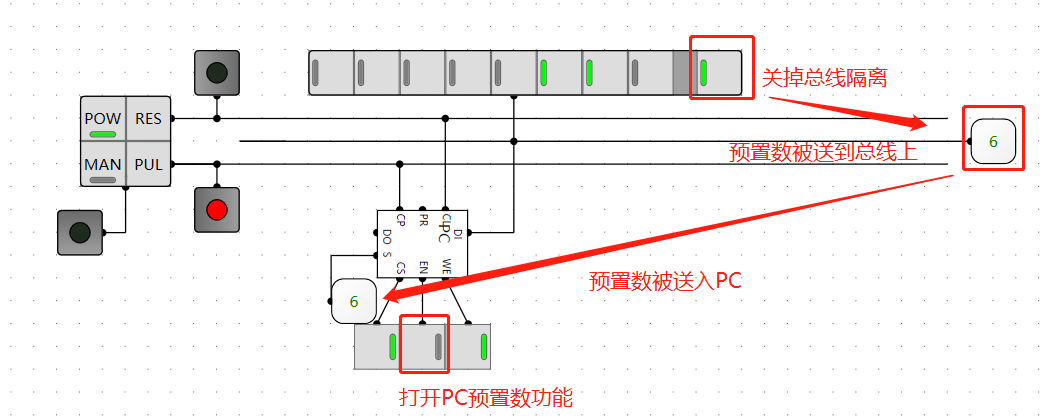 打开PC计数功能,计数器从6开始自增,打开预置数器的总线隔离,总线上数据6消失