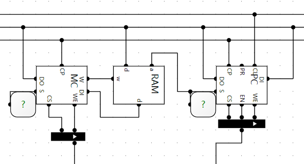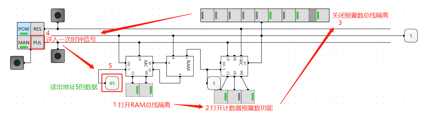 现在要指定读RAM的5地址的数据,查的是85,读取步骤:打开RAM总线隔离(CS=WE=1)->打开计数器预置数功能(CS=WE=1,EN=0)->关闭预置数(提前设置为5)总线隔离->给一个时钟脉冲