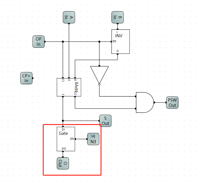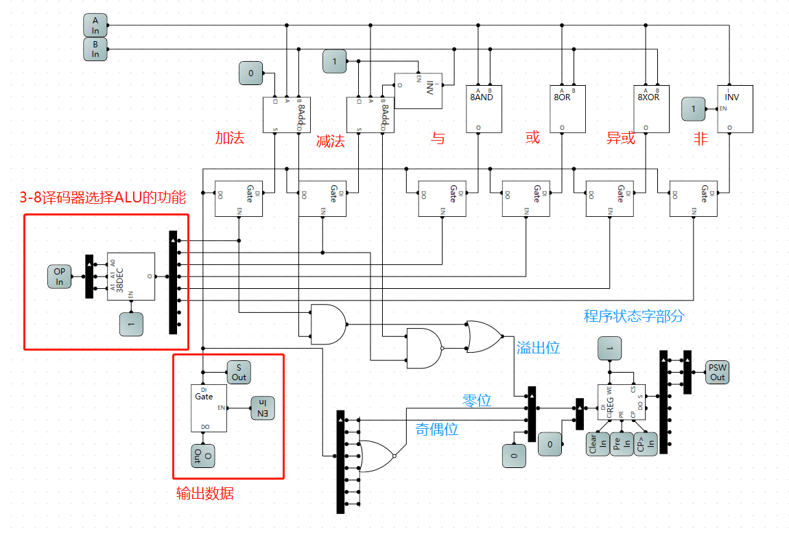 然后我们将以上的功能添加到ALU上,同时将运算过后的输出状态输出到程序状态字