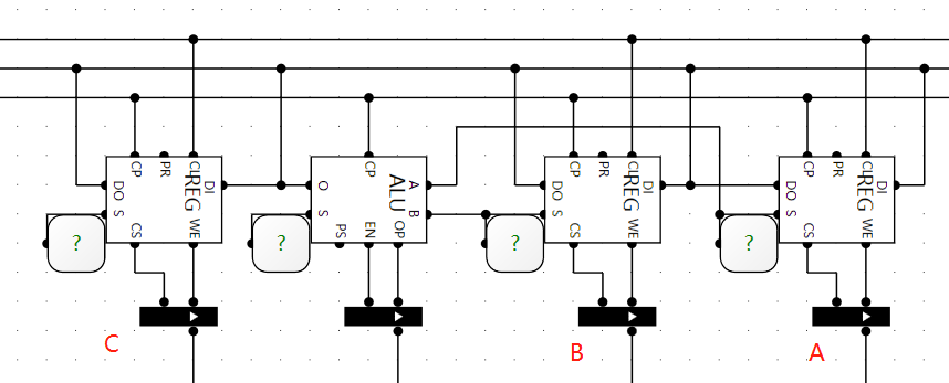 ALU运算单元设置为加法使能(OP=0,EN=1),然后将寄存器C的写打开(CS=WE=1)