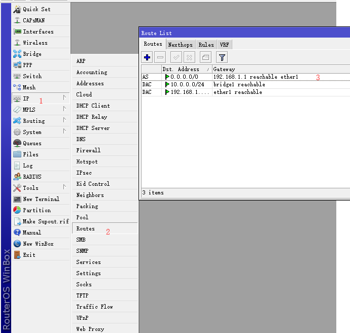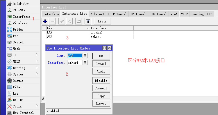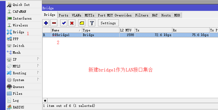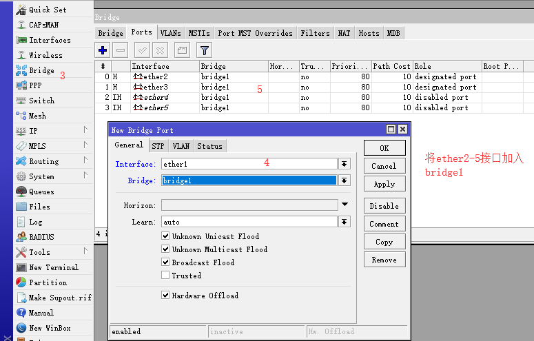 - 先分配5个接口,ether1为WAN,ether2-5为二层lan接口(新建接口bridge1将2-5接口放入此接口)