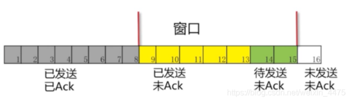 如图所示,窗口的左端是已经发送并且得到ACK的分组,窗口内黄色的是已发送但未ACK的分组,绿色是能发送的分组,白色是暂时不可发送的分组。