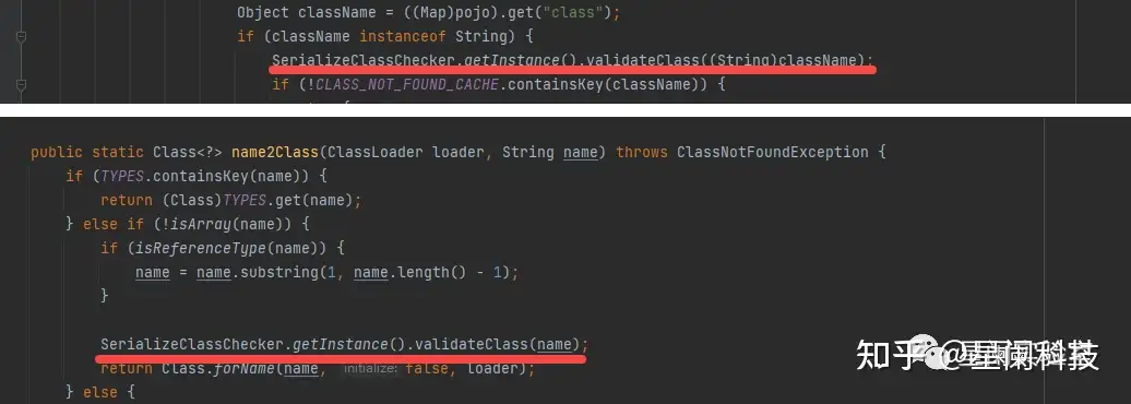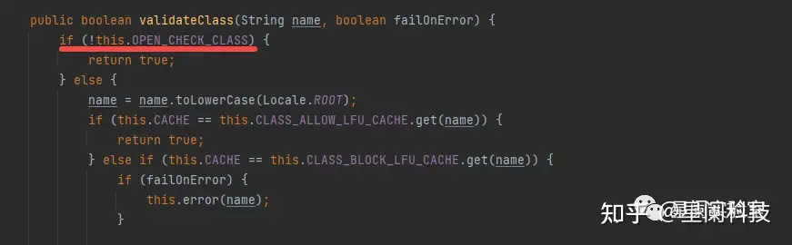 validateClass方法首先会对OPEN_CHECK_CLASS属性进行判断,如果这个属性为false,那么就不会对传入类进行检查,直接返回。那么其中一种绕过的方式就是,设置OPEN_CHECK_CLASS属性为false,从而绕过黑名单检查。