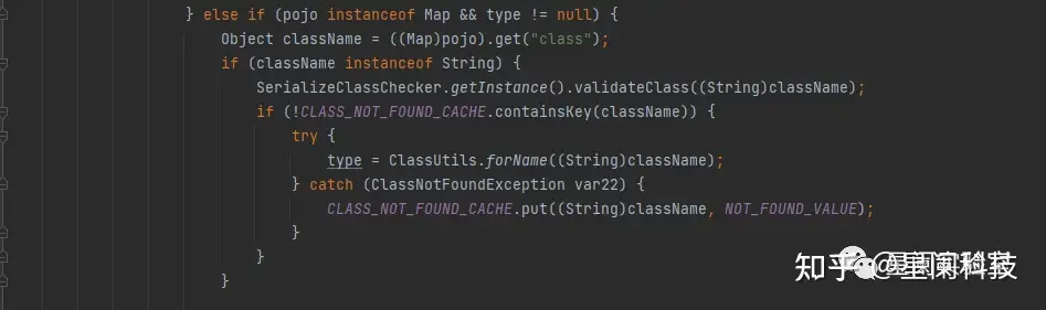 若pojo为map实例,则获取key为"class"的值,并通过反射得到class所对应的类type,后续处理中经过判断:如果type不是Map的子类、不为Object.class且不是接口,则进入else,对type通过反射进行了实例化,得到对象dest。