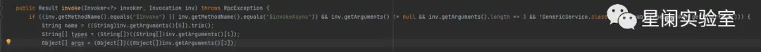 检查方法名是否为$invoke或者$invokeAsync、检查参数是否不为null、检查参数长度是否为3、检查invoke对象接口是否不是通过GenericService继承的,校验通过后就会通过getArguments() 获取参数,三个参数name、types、args分别为 String 类型、String 数组类型和Object 数组类型。