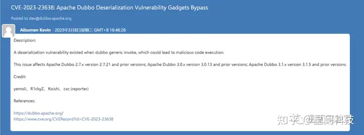 更加详细的分析和注意事项可以参考X1r0z师傅的文章:https://exp10it.cn/2023/03/apache-dubbo-cve-2023-23638-%E5%88%86%E6%9E%90/,当然CVE-2023-23638利用方式也不止这一种,可以参考其他师傅们优秀的分析文章。