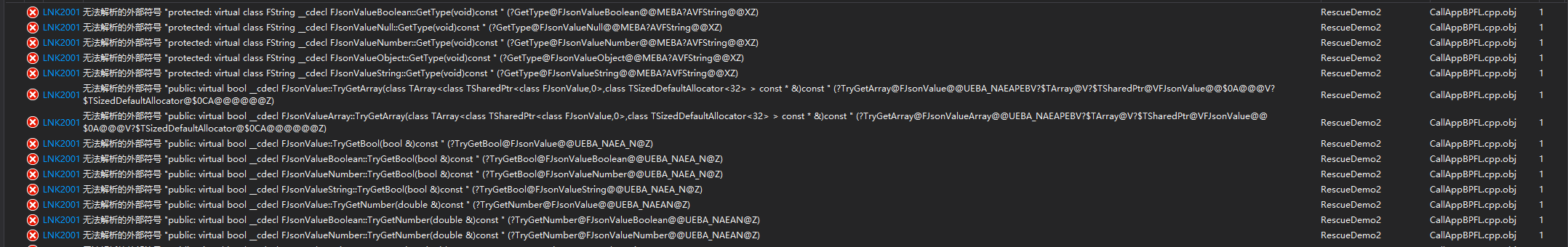 问题:UE4解析json时候遇到的LNK2019无法解析外部符号和LNK2001无法解析外部符号(如下图所示)