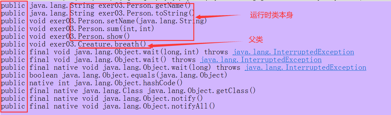 //getMethods():获取运行时类及其父类的声明为public的方法