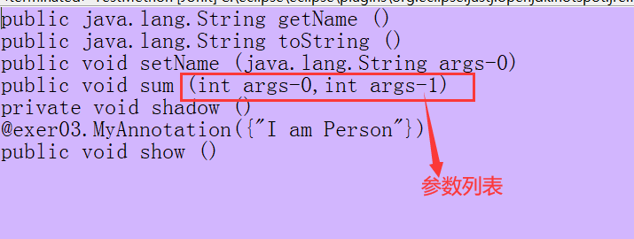 System.out.print(param[j].getName() + " args-" + j);