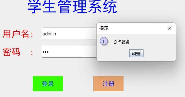 JOptionPane.showMessageDialog(jFrame,"密码错误","提示",JOptionPane.INFORMATION_MESSAGE);