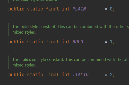 - Font.PLAIN 表示正常字体(除此之外,还有粗体BOLD和斜体ITALIC)