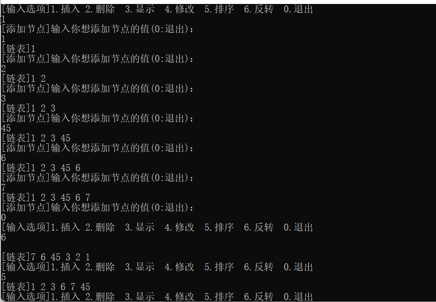 printf("[输入选项]1.插入 2.删除 3.显示 4.修改 5.排序 6.反转 0.退出\n");