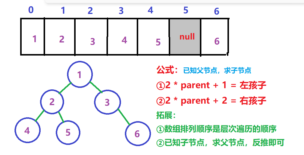 二叉树用数组存储,应该将空节点设置成null,如下图。