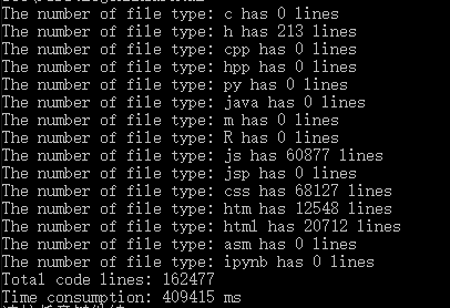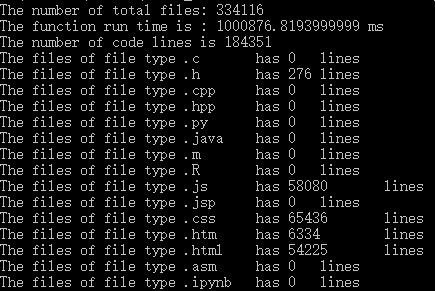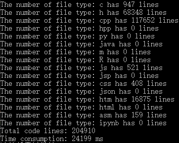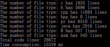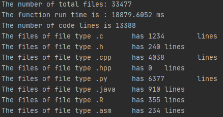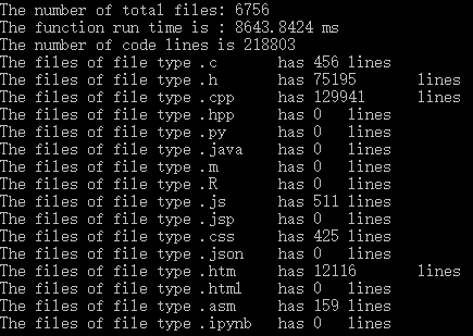 根据先前实现的程序,我已经完成了通过命令行设置指定文件夹路径,并且显示该路径下所有指定文件目录file_type_path.txt中包含的文件名的文件的绝对路径。在本次实现的项目中,我需要完成的是,对给定绝对路径的文件中的代码行数进行统计,并且汇总代码总量、文件总量和总耗时。