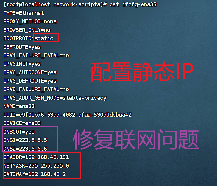 这两篇文章都在修改同一个文件:vim /etc/sysconfig/network-scripts/ifcfg-ens33