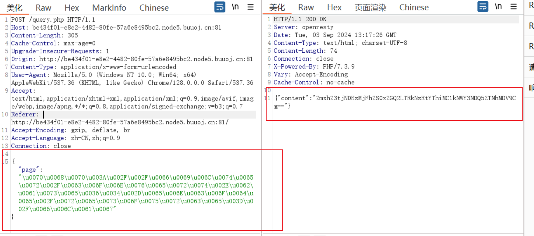 我们要使用POST方法传入格式为{"page":"xxx"}的内容,然后page的值到了$content里面,需要绕过