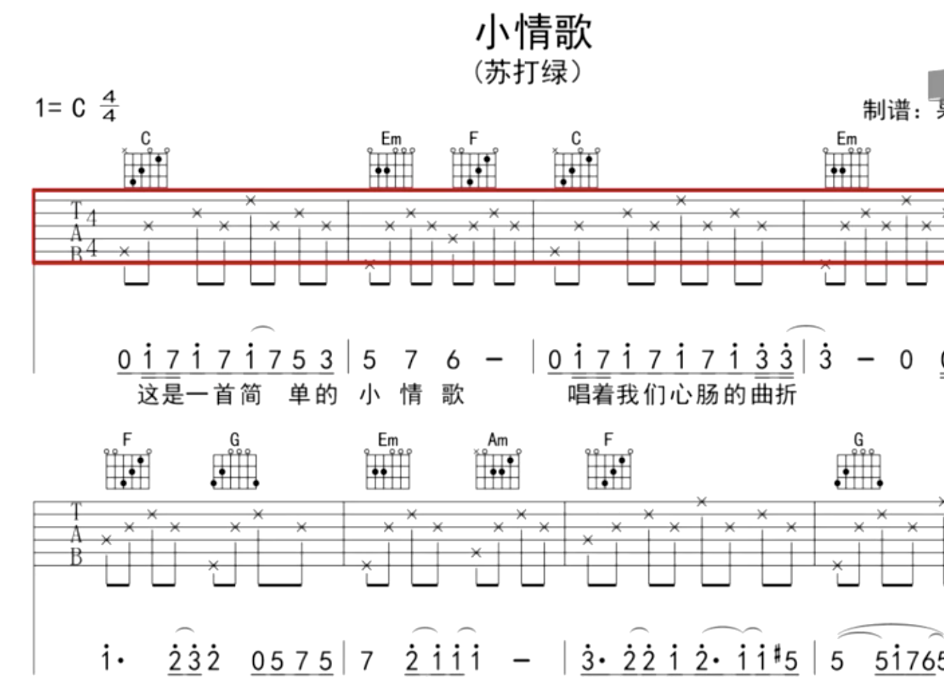 1、标准吉他弹唱谱《小情歌》