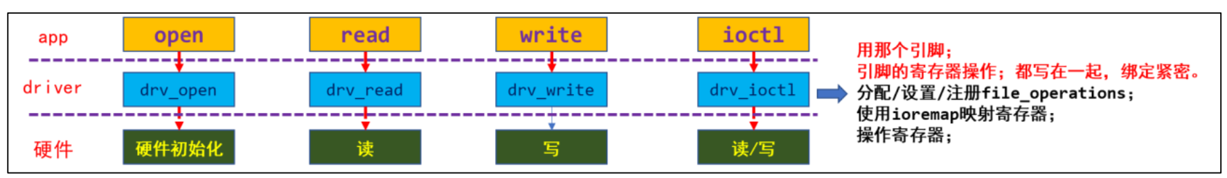 传统的驱动编写如下图所示,引脚的寄存器操作和代码紧密绑定,不易扩展,框架不够清晰