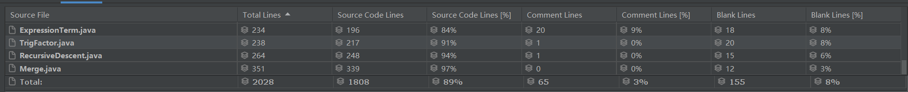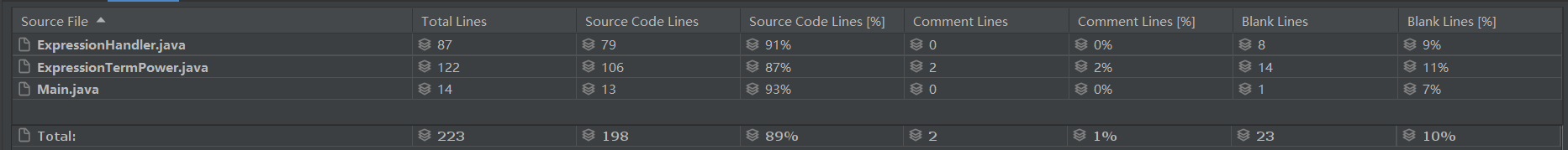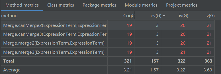 复杂度最高的类是两个递归下降类,一个用于判断表达式是否格式正确,一个用于解析表达式(这个类和上次作业完全一样),然后就是合并和表达式项的类,整体的平均复杂度也有一点上升。