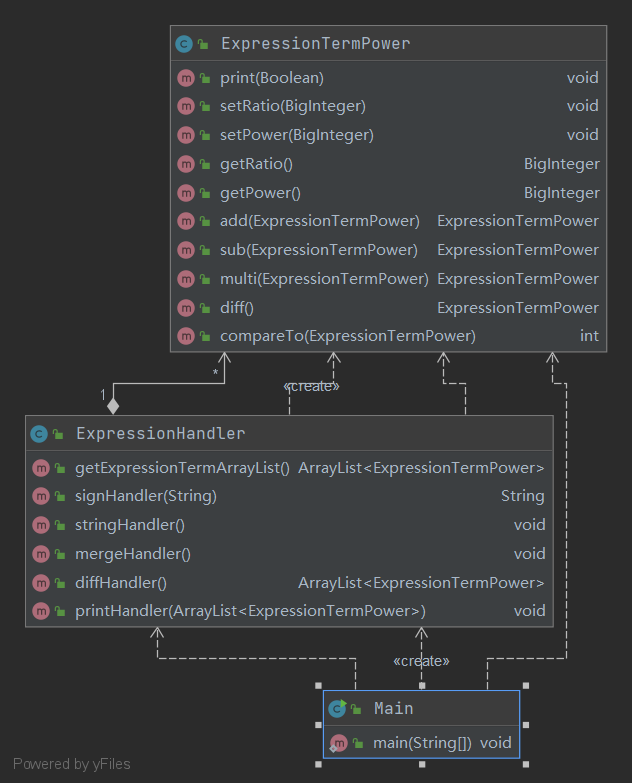 本次作业因为只有多项式,也没有过多的考虑扩展性,因此只有三个类,也没有什么继承,其中ExpressionTermPower 是多项式类,用系数和指数来构造一个多项式项,ExpressionHandler用于处理表达式,其中使用了正则替换也就是删除空格和\t,连续的+/-替换成一个+/-,为了让项的格式统一,在第一个项之前没有符号的时候补上一个+