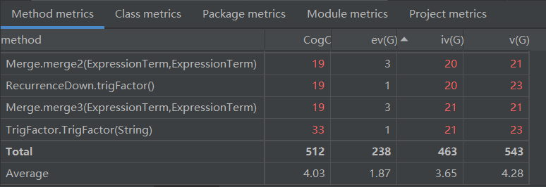因为类较多,因此截图显示出现红色警告字体的部分 ,复杂度较高的类主要是递归下降,表达式合并表达式,表达式项的类。